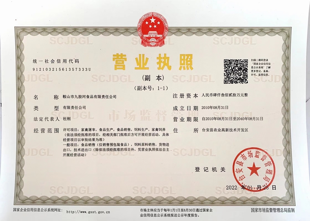 1997年丨九股河誕生于遼寧臺安,成立臺安縣九股河農業發展有限公司2003年丨九股河走進錦州市,在凌海成立凌海九股河食品有限公司2008年丨成立凌海九股河飼料有限公司2010年丨九股河與禾豐合作后,成立鞍山市九股河食品有限責任公司,從此,禾豐九股河走進了高速發展之路2011年丨繼續在遼西闊步,成立葫蘆島九股河食品有限公司同年,臺安縣九股河農業發展有限公司養殖部成立,按下規模化籠養小區建設的快進鍵2